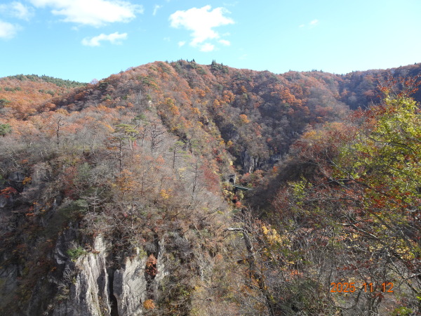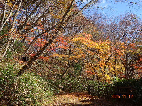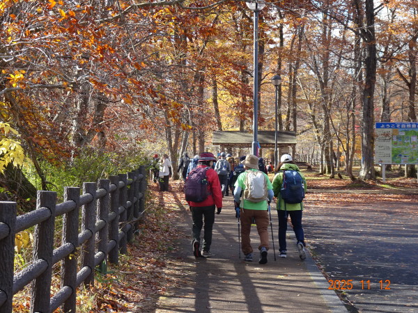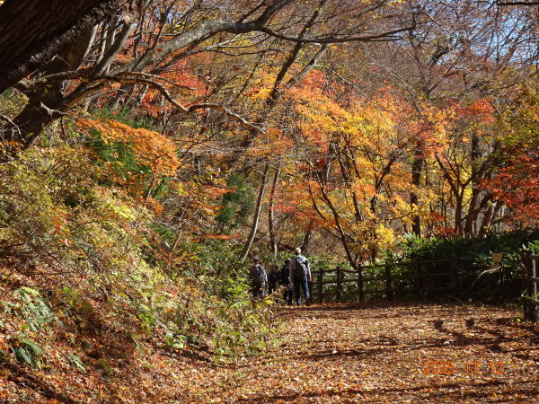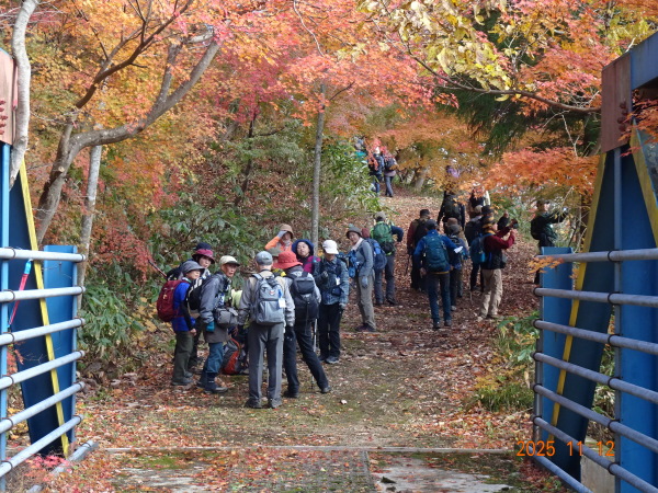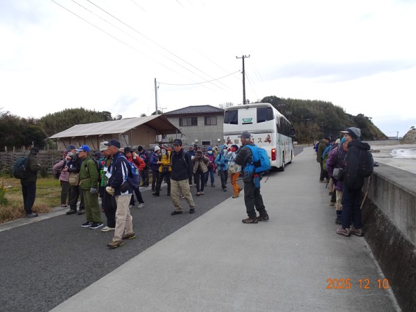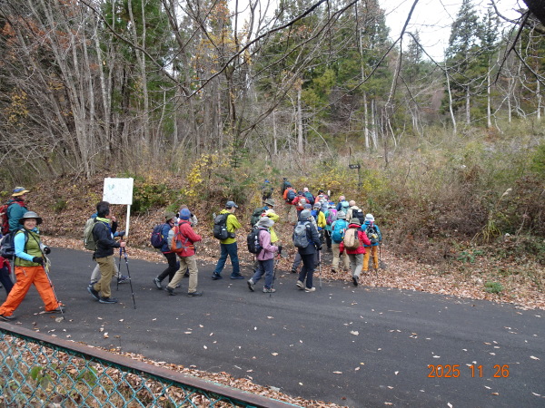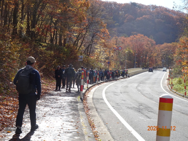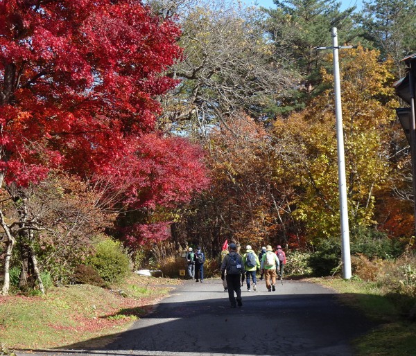 県道を歩いてバスの待つ広場に。皆さん疲れもなく今日の好天を思い存分楽しみました。 |