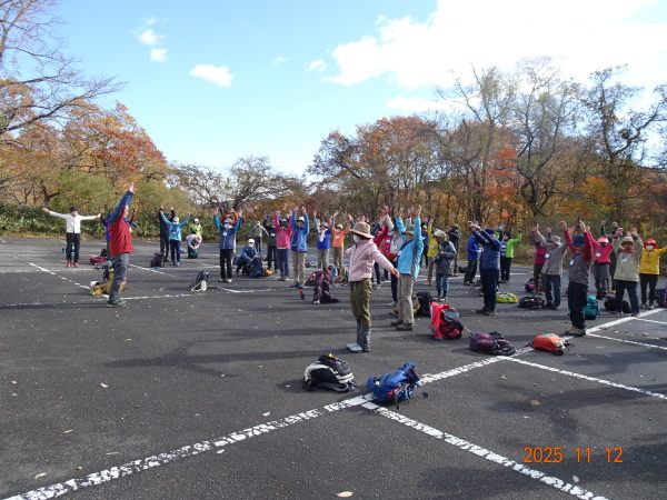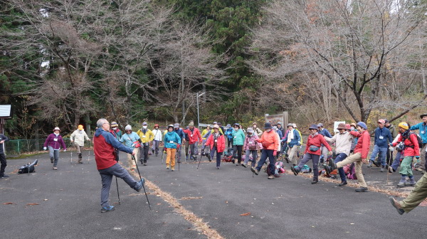 温泉旅館の駐車場をお借りしての準備体操、今回も体操おじさんが