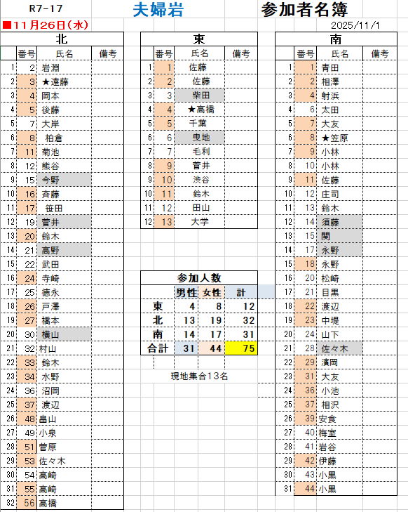 参加者名簿 25,10,30現在 現地集合の方(13名)も含んでいます。