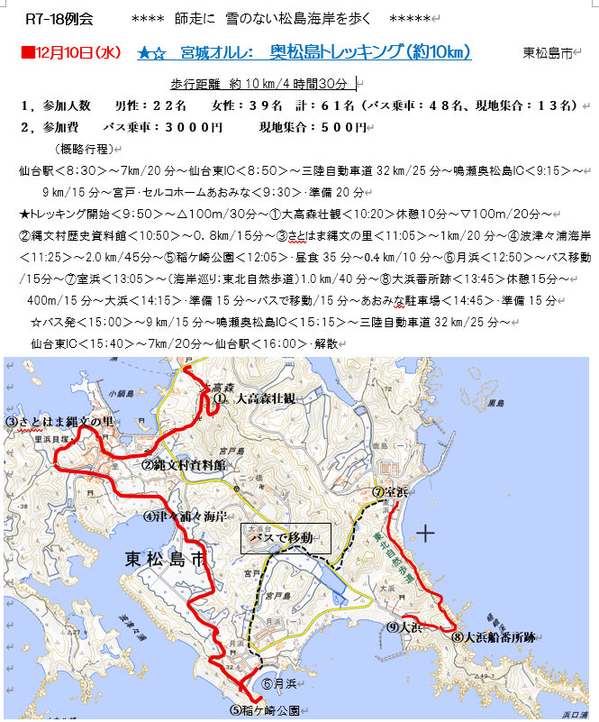 ② 曇り空、時折小雨、時折薄日の空で61名の参加者は皆さん元気であった。
